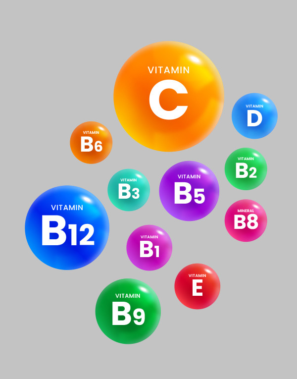 (Vitamine D, Vitamine E, Vitamine C, Vitamine B1 (Thiamine), Vitamine B2 (Riboflavine), Vitamine B3 (Niacine) Vitamine B6, Vitamine B9 (Acide Folique), Vitamine B12, Vitamine B8 (Biotine) et Vitamine B5 (Acide pantothénique))